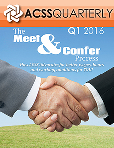Learn more about the Meet and Confer process of ACSS' Group Representation in the latest issue of the Q1 2016 ACSS Quarterly Newsletter publication. This issue explains how ACSS advocates for better wages, hours and working conditions for YOU! Also, in the President's Corner, ACSS President Frank Ruffino reflects on the achievements of ACSS in 2015, and discusses his vision for ACSS in 2016.