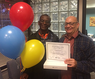 Adams Yussif (left) receives his new iPad from his supervising manager at CDPH.